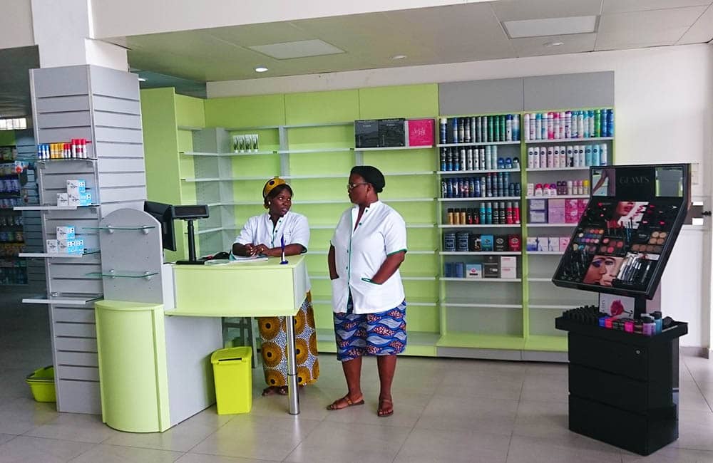 Nous avons réalisé la pharmacie du Dr Sakari Tidjani à Lomé au Togo. Nous avons travaillé l’agencement d’un grand espace avec la création d’un sens de circulation. Quatres comptoirs d’accueil doubles forment une ligne en fond de pharmacie et un accueil spécifique est dédié à la parapharmacie. Les murs sont occupés par des présentoirs pour les produits de beauté, de parapharmacie et du quotidien.